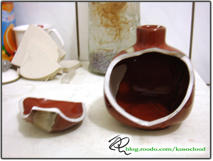 有圖有真相,下面就是無辜的洗手台跟陶壺,下次我真的不能把貓關起來,不然下次變馬桶壞掉嗎?(唉...到時候還房子要賠一個洗手抬了>"<)