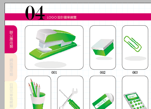 以上是類似的內容,在InDesign CS4的預覽模式下,左邊頁眉的「辦公應用類」很清楚的出現白色字,這個沒有做什麼特別處理,只是把文字放到圖形上,文字顏色是紙張色,紙張色是不會有疊印效果的才對,但是呢,我們看看接下來的發展: