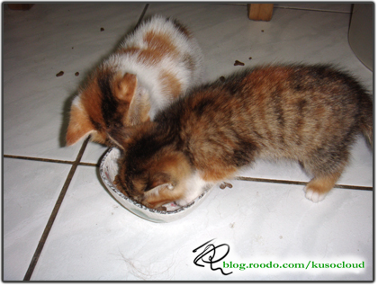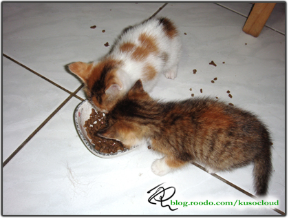 這個碗是裝豆花飼料用的,平常都放在夾層中,以防止肉圓把豆花的飼料吃掉,結果這兩隻小貓倒是厲害,為了找吃的,把夾層裡的飼料碗給弄翻了,灑了一地的飼料,兩隻小貓好像餓了好幾天地猛啃。不過畢竟他們牙齒長的還不夠大,我看他們只是乾過癮,啃了那麼久,也沒啃下多少,還是我去廚房弄了他們的牛奶,這次兩隻都會跑過來喝奶了,而且是喝個精光。