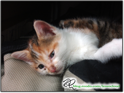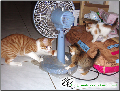 早上餵完奶之後,兩隻小貓就很有活力地四處跑,然後豆花也在旁邊不知道是跟他們玩,還是要欺負他,搞不懂...XD