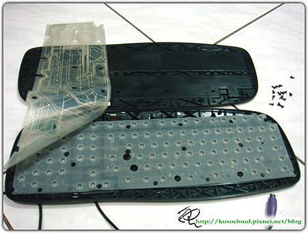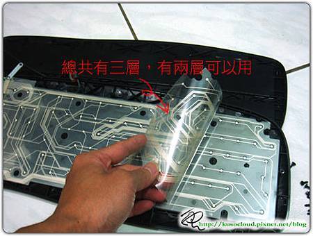 一般的便宜鍵盤都是薄膜式鍵盤,從鍵盤背面支解後,會看到這樣的結構