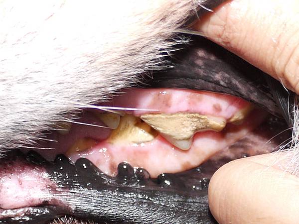 這是肉圓左邊的牙齒,可以很清楚看到最大顆的牙齒上面有一層討厭的牙結石,從照片特寫中可以看到有一部分光滑的表面,有些是因為啃了豬腳後,牙結石剝落後的樣子,但是這還不夠威,夠威的是下面的那張圖.....