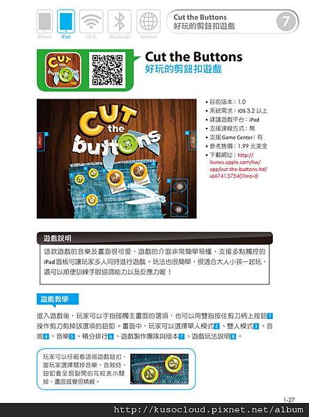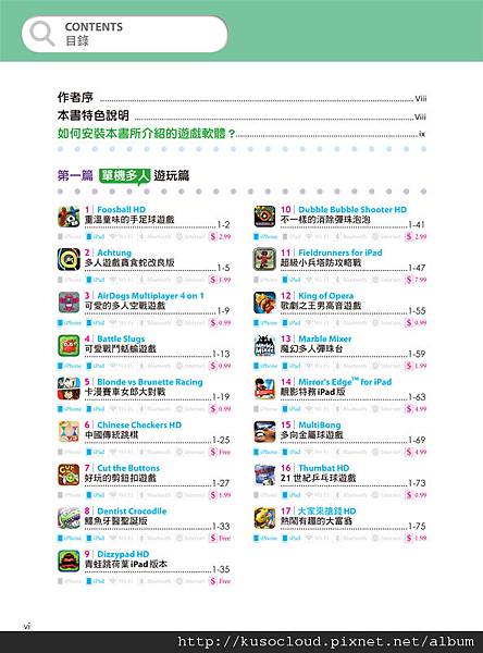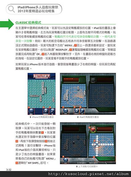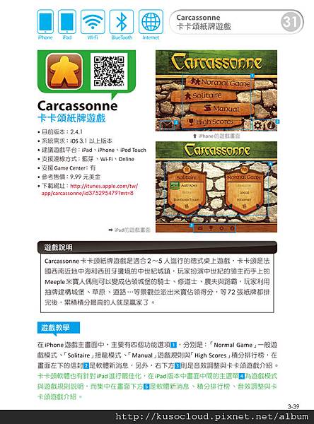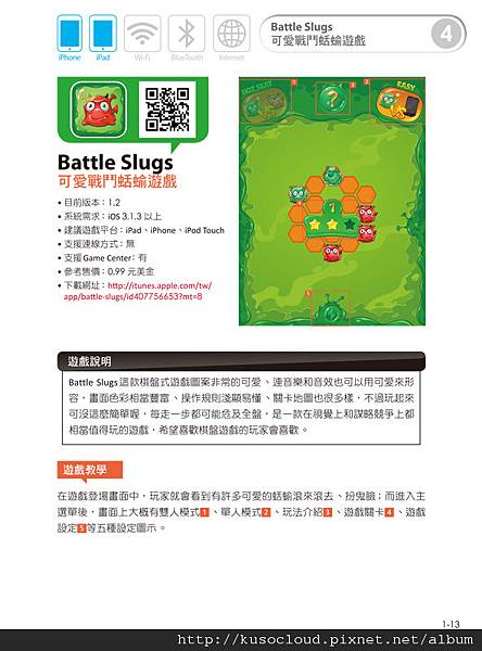 關於遊戲攻略的說明,真的是一件很重要的特色喔!舉例來說,有一個遊戲「Dots-n-Boobs」炸彈格子棋,我先前在去年剛推出的時候有下載,但是因為不懂規則,自己摸索了一個多小時還是不太懂玩法,就覺得好難玩,然後把他刪掉。直到我現在邊這本書的時候,看到作者寫的遊戲規則說明,才瞭解了這個遊戲的玩法,才發現這個遊戲蠻適合我的,玩起來還真是有趣殺時間說。以前都是被電腦狂電,現在都覺得電腦好肉腳說~ XD