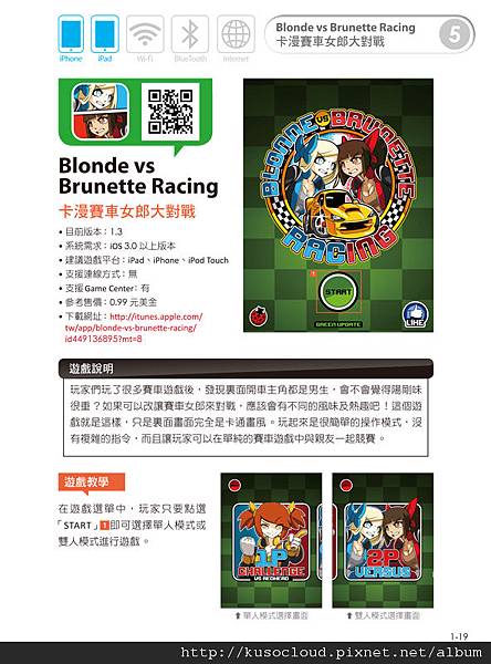 每個遊戲的介紹畫面,第一頁大致上有遊戲名稱、簡介、截圖、遊戲教學等等...最上方的小圖示可以辨別這個遊戲的適用機種、連線模式等等