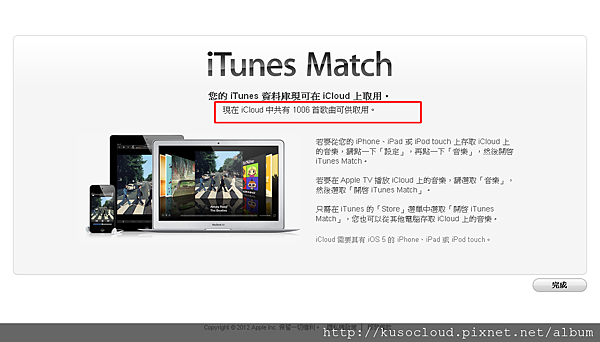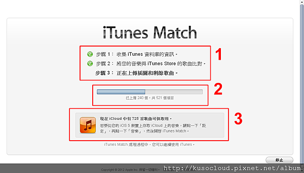 ↑加入過程,就跟第一次申請iTunes Match服務一樣,會有三個步驟。畫面圖號(1)表示會敬過的三個步驟;畫面圖號(2)表示上傳的進度,我電腦裡的音樂有2.16GB,不知道是不是容量太大,所以上傳了很多次才成功說...Orz;畫面圖號(3)則是教使用者晚一點要怎麼開啟iTunes Match。