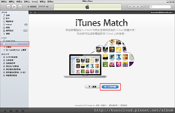 ↑首先,要先確認已經申請了iTunes Match的服務,這樣子就可以把其他台電腦裡的音樂,也上傳到Apple的雲端空間中,如果你有很多台電腦、很多種不同音樂,就真的是很大的福音啊~ XD