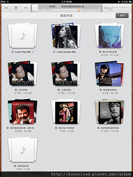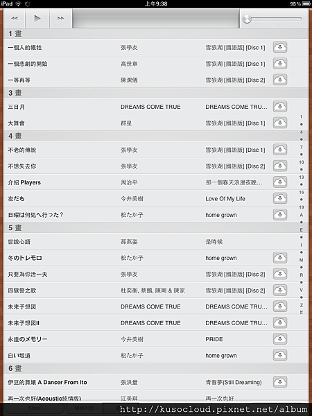 ↑再到「音樂」中,就會看到一脫拉庫的新增新增音樂囉,每首歌的右邊有個雲朵圖案,就表示那首歌存在雲端上,不會佔用你的iOS裝置的容量,當我們點選它的時候,才會開始播放並下載到iOS裝置中