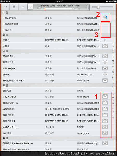 實際來看看,當我們點選雲朵圖案的歌曲時(1),就會從雲端播放與下載歌曲到iPad中,下載的時候會出現圓圈的進度圖(2),如果歌曲的右邊沒有圖案的話(3),就表示這首歌已經存在本機端,也就是會造成增加儲存容量的結果。