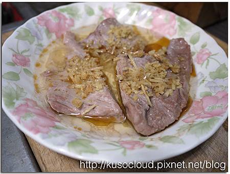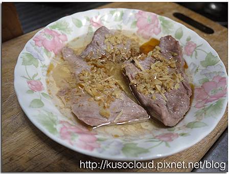 今天因為早上忘記把昨天買的貴鬆鬆肉排拿出來退冰,所以回到家後先把肉排拿出來,隔著塑膠袋泡水退冰,再帶肉圓去公園遛躂,回家後也懶得煮麵了,想說就直接用蒸的試試看。所以這一次做法更簡單了,把肉排放在盤子上,老薑切末撒上去、再淋一點點米酒跟麻油,然後就放電鍋去蒸,蒸好後就有淡淡的麻油清香,肉排吃起來也不錯,老薑也不會太辣,很可口呢~