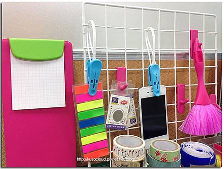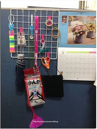 在辦公室的隔間上,使用網隔板加上掛鉤、曬衣夾,就可以置放很多雜物