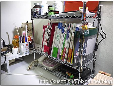 在B&Q裡可以買到的小鐵架,意外地可以成為複合式收納架,原本困擾的電話跟數據雞不知道要放哪,現在放在這個鐵架的下方還真是適得其所啊~