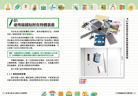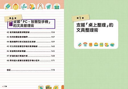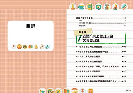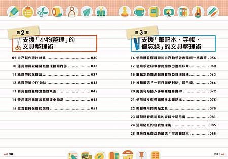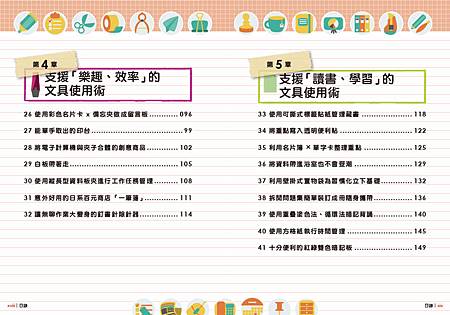 這本書裡面共有48種好點子,用在整理、學習、手帳與筆記本上四大主題上,原書是一本日文單色文庫本的書,當初會選這本書也是因為文具書這類的主題很受歡迎,但是搞不懂很有美感的日本人怎麼把好端端的把一本文具書做成黑白呢?所以在引進之時,就已經想好要把它做成彩色、並且大改版面設計,讓書的內容可以看起來比較活潑、有趣。