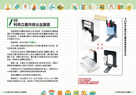 在編輯這本書的時候,經常讓我產生「原來如此!」的感嘆,例如用個網隔板,就可以創造出很多種收納的方式;或是一個立書夾,可以衍生變化出很多種用途;不管是磁鐵還是軟磁鐵,原來都有這麼多的附加作用;還有最讓我覺得很好笑的是,原來曬衣夾可以拿來夾我的iPhone,然後掛在牆壁上,真是太酷了!