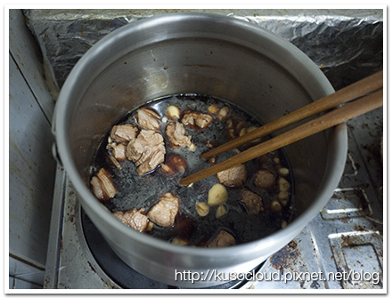 - 開大火煮滾後,轉小火,大約煮個半小時讓湯汁收汁,肋排顏色看起來深沈即可。