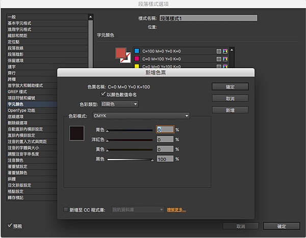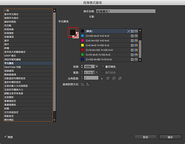 方法是這樣的,下面以「段落樣式選項」視窗設定做說明(參考下圖)。在「字元顏色」頁籤中,可以看到跟色票面版相似的介面,通常我們會在右邊選擇已有的色票來使用,如果沒有想要的色票,這時候只要按下下圖紅框標示的大色票圖示。