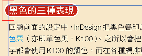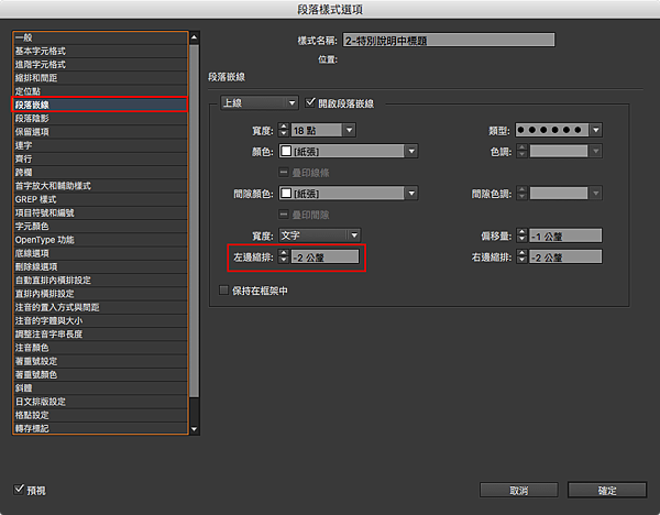 在這個特殊標題設計中,因為段落嵌線的「左邊縮排」為-2,所以就可以看到標題往左突出了一小塊地方,本來在印刷上並沒什麼問題的。