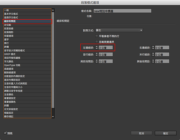 所以,我想了一下,發現其實很簡單,就是讓段落嵌線不要凸出去嘛,所以我在「縮排和間距」頁籤這邊,把文字的「左邊縮排」設定為2公釐,這樣就可以抵消掉段落嵌線凸出去的那2公釐。