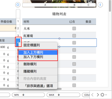 有在使用Mac上的試算表軟體Numbers的人,應該對於要新增一行(欄)或數行(欄)的儲存格時,對於只能在橫列的編號列(或直欄的字母列上)按右鍵再選擇「加入上方橫列」(「加入前方直欄」)或「加入下方橫列」(「加入後方直欄」)感到很麻煩吧?