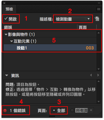 回到「預檢」面板後,依照下圖順序開啟預檢功能,並且設定剛剛建立的描述檔去檢查,然後就看到檢測出錯誤了~