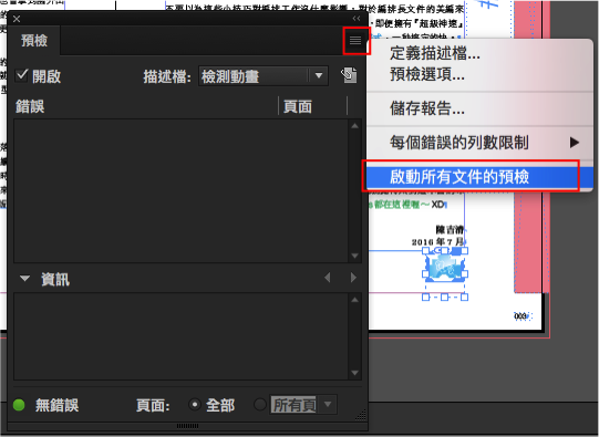 因為是檢測整個書冊的所有文件,所以在按下右上方的功能選單,選擇「啟動所有文件的預檢」。這樣就能保證書冊內所有文件都能夠檢測到了~