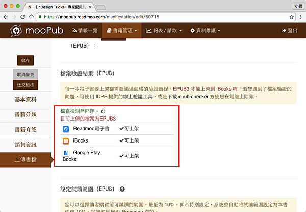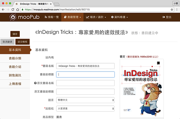完成註冊後,就可以把書上傳到mooPub上面,因為過程太簡單,所以很快跳過去。下圖是我把我的電子書ePub3檔案上傳後,自動顯示出來的資訊,mooPub蠻聰明的,會把記錄在ePub3檔案裡的中繼資料載入進來。順帶一提,mooPub只接受ePub3格式的電子書喔,PDF就不要來這裡亂了~