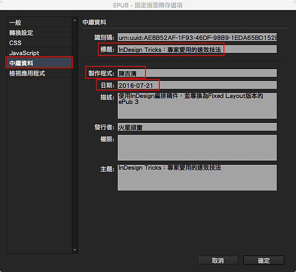 那麼我在InDesing中的ePub輸出設定為什麼呢?原來是“YYYY/MM/DD”的格式,所以就產生錯誤了,這點應該是InDesign要去優化的地方才對,避免使用者用到錯誤格式啊~所以說呢,請大家再輸出ePub時,「中繼資料」裡的內容格式要填寫正確。下圖中的標題代表書名、製作程式代表作者名稱,這個譯名Adobe也應該好好改一下才對....= =