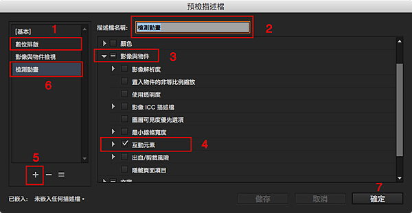 在開啟「預檢」面板後,我們先來設定描述檔,設定步驟如下圖所示,先用「數位排版」為範本,尋找「影像與物件」中的「互動元素」,將它勾選後按下「+」新增然後儲存。
