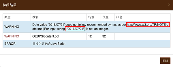 其實在錯誤清單中,也會告知錯誤的內容,如下圖所示,第一個問題是時間格式碼錯誤,甚至會標示參考網址。