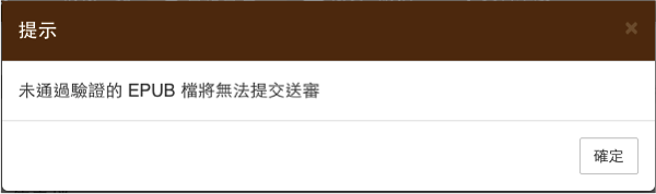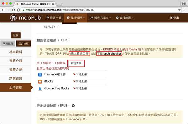 然後啊,我在「上傳書檔」標籤中看到我的電子書GG的訊息,如下圖所示。在這個頁面中有幾個重點,第一個是你可以用ePub-checker來檢查你的ePub3檔案,並且提供下載連結;第二個是告知你有幾個警告與錯誤,可以按下「錯誤清單」來查看;第三個是跟你說Readmoo、iBooks、Google play沒有通過檢測就別想上架。