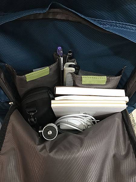 而在正前方拉開的拉鍊袋中,有附上基本的幾款口袋,可以用來放置隨身硬碟、行動電源、滑鼠、筆等等適合口袋裡放置的物件。