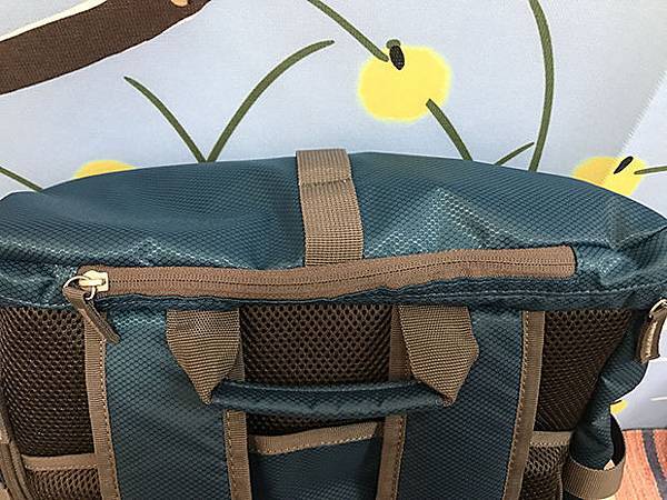 從正面來看,有一個手提拉把,可以搭配上方的G型扣環扣住包包後直接橫提著移動,方便在不同場合下提拿包包。而下方有一個扣環,可以搭配其他的扣環來放東西,例如登山時可以放垃圾袋、或是裝食物、鍋子的袋子等。